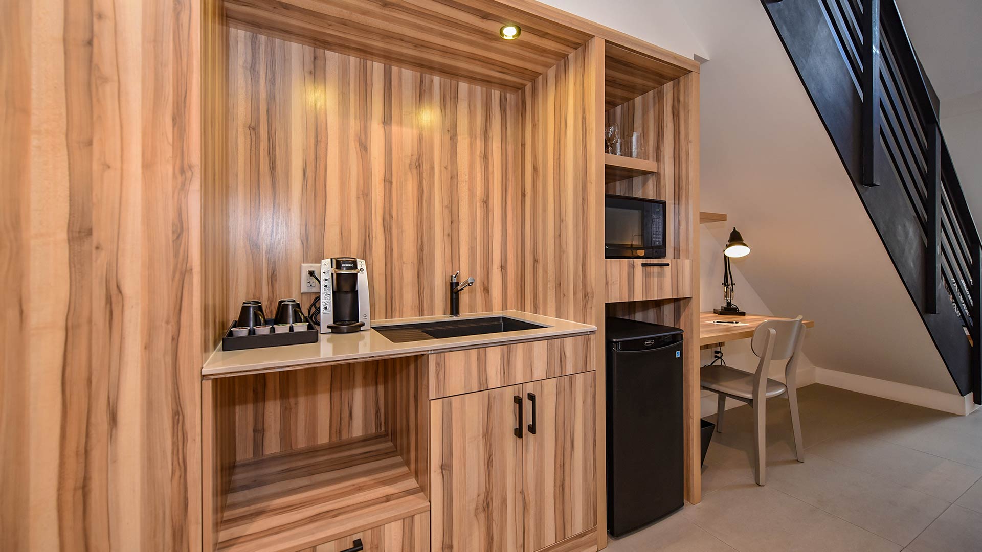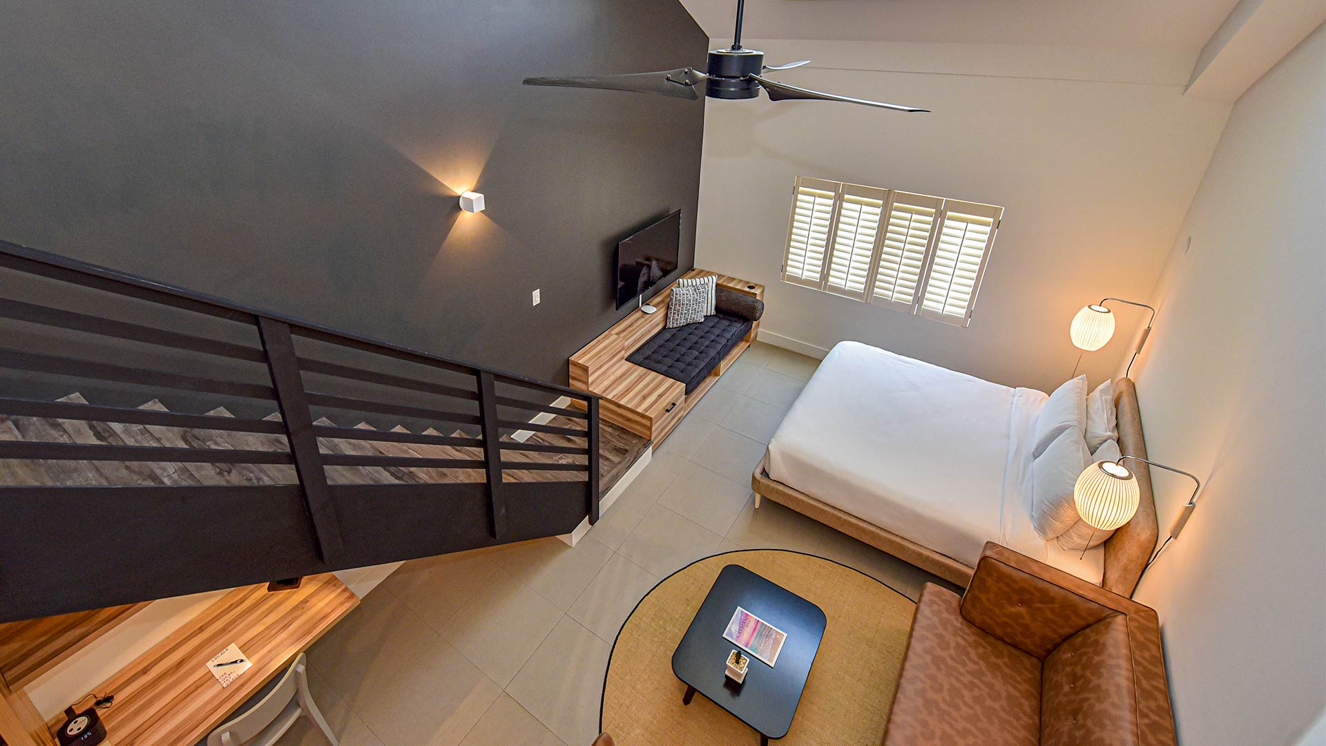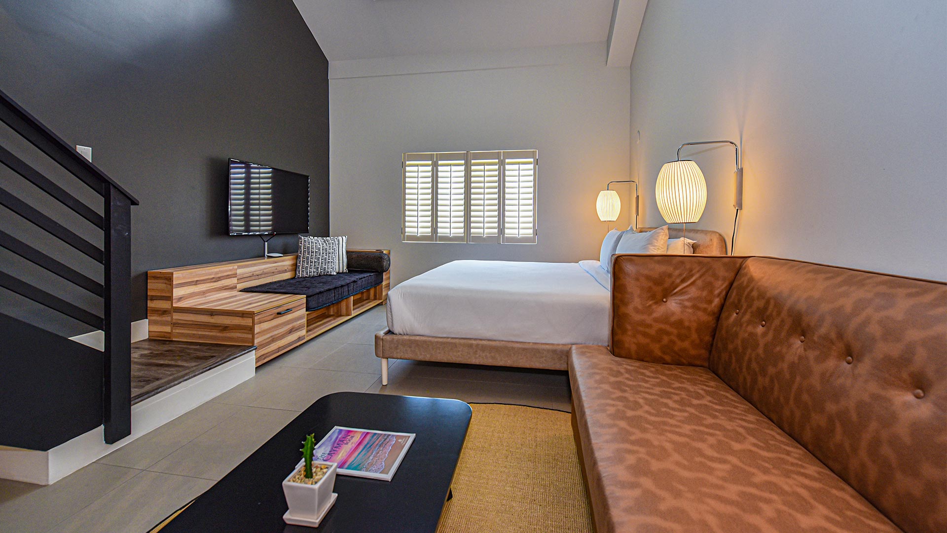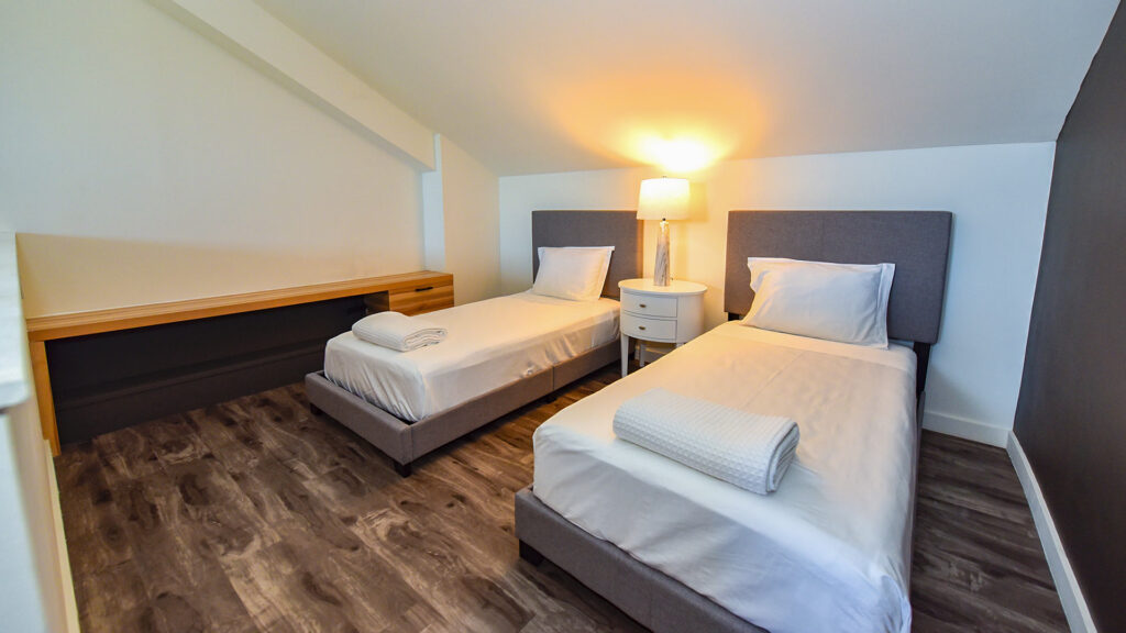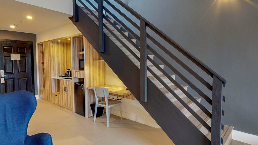 Featuring a functional living space furnished with a King bed, Queen sleeper sofa, and loft with 2 Twin beds, our 575 sq. ft. Family Suites easily sleep up to 6 guests. For guest convenience, a food preparation area with a mini-fridge, microwave, and coffee maker is available. Relax in air-conditioned comfort and watch movies on the flatscreen TV with cable TV, call the front desk with the Alexa digital assistant, and enjoy complimentary Wi-Fi throughout the suite.